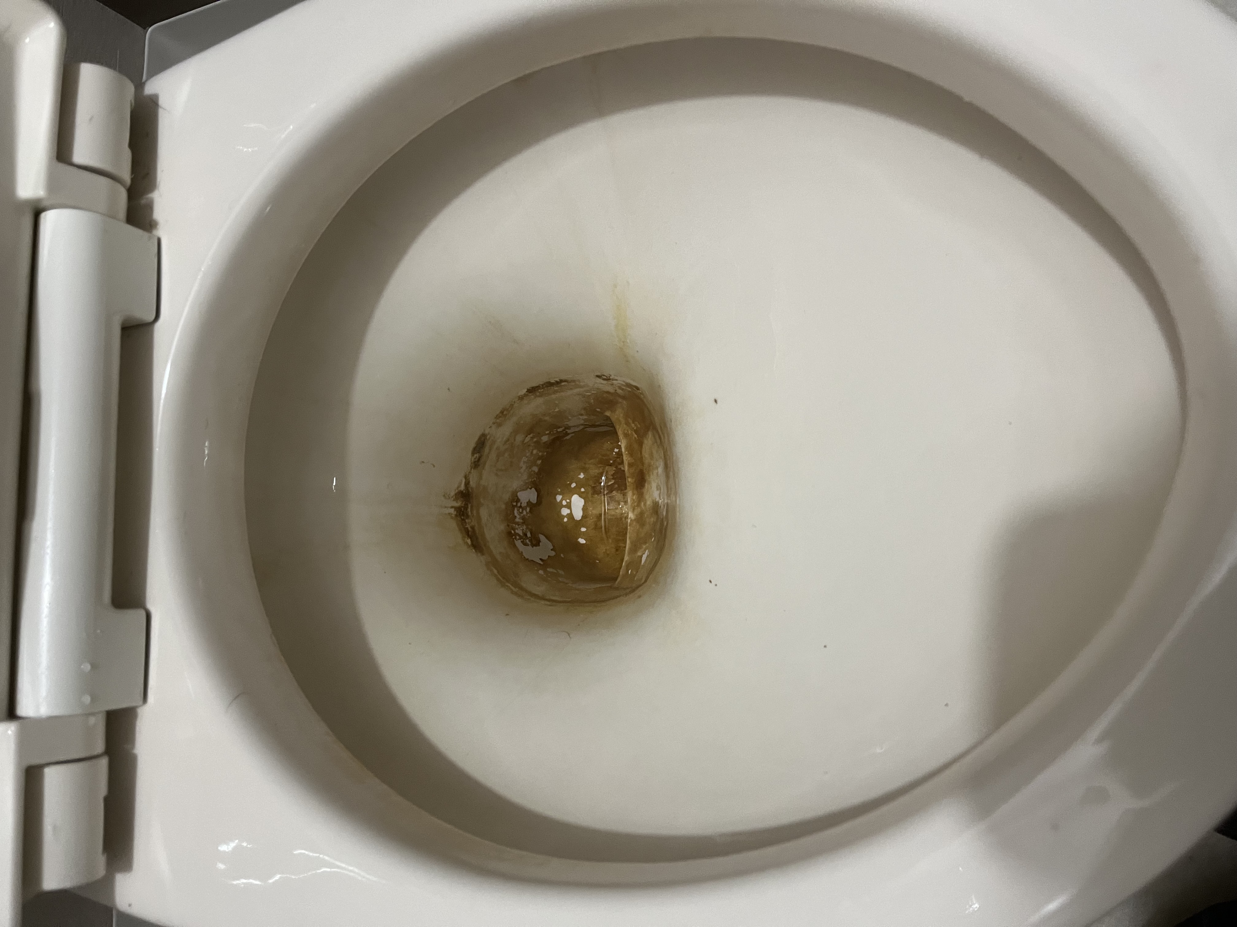 黄ばみだけでなく、石のように硬化しており、通常の中性洗剤や軽い清掃では除去できないレベルです。